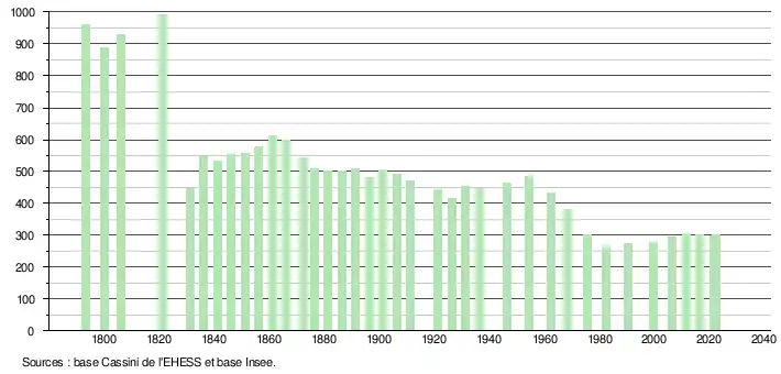 L'évolution du nombre d'habitants est connue à travers les recensements de la population effectués dans la commune depuis 1793. Pour les communes de moins de 10 000 habitants, une enquête de recensement portant sur toute la population est réalisée tous les cinq ans, les populations de référence des années intermédiaires étant quant à elles estimées par interpolation ou extrapolation[31]. Pour la commune, le premier recensement exhaustif entrant dans le cadre du nouveau dispositif a été réalisé en 2006[32].