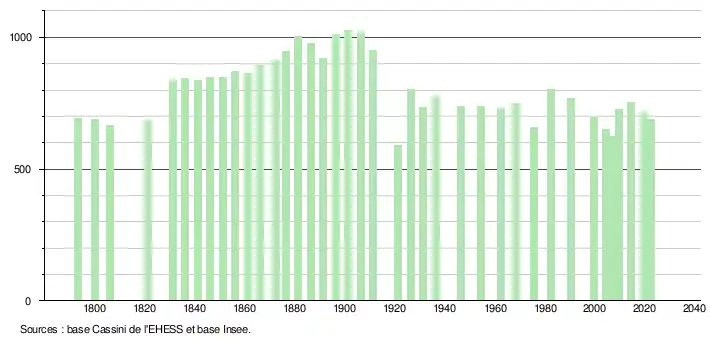 L'évolution du nombre d'habitants est connue à travers les recensements de la population effectués dans la commune depuis 1793. Pour les communes de moins de 10 000 habitants, une enquête de recensement portant sur toute la population est réalisée tous les cinq ans, les populations de référence des années intermédiaires étant quant à elles estimées par interpolation ou extrapolation[30]. Pour la commune, le premier recensement exhaustif entrant dans le cadre du nouveau dispositif a été réalisé en 2004[31].