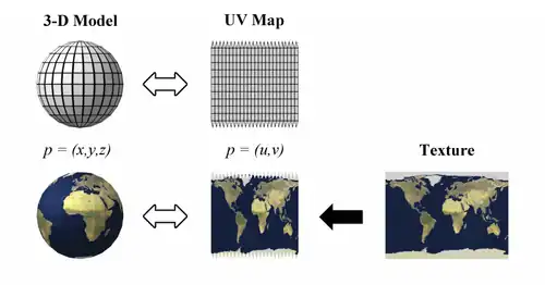 La texturation UV permet de peindre en couleurs (et autres attributs de surface) les polygones composant un objet 3D à partir d'une image ordinaire. L'image s'appelle une carte de texture UV[1]. Le processus de cartographie UV consiste à attribuer des pixels d'une image à ceux de la surface d'un polygone, généralement en copiant « par programmation » une partie triangulaire de l'image et en la collant sur un triangle de l'objet[2]. La texturation UV est une alternative au mapping de projection (par exemple, en utilisant n'importe quelle paire des coordonnées X, Y, Z du modèle ou toute transformation de la position) ; il ne fait que correspondre à un espace de texture plutôt qu'à l'espace géométrique de l'objet. Le calcul du rendu utilise les coordonnées de texture UV pour déterminer la manière de peindre la surface tridimensionnelle.