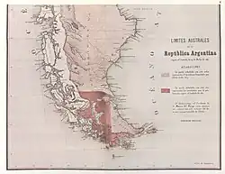 - La carte publiée en 1887 par le Bureau argentin de l'information à Londres: La note no 102 concerne cette carte. Il refusa l'argument : « une ligne de démarcation complètement fantaisiste qui pouvait avoir aucune justification possible dans le cadre du traité de 1881 ». La carte a été corrigée par le même bureau sur la carte publié l'année suivante, elle est disponible ici.