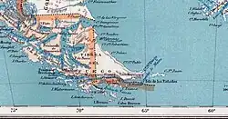 Reconstruction de la feuille « Ushuaia » de l'édition 1967de l'« Instituto Geográfico Militar (es) » (Argentine). Seule la frontière et la toponymie océanique sont copiés à partir de l'original sous droits d’auteur. Un plan similaire fut publié en 1948[13].