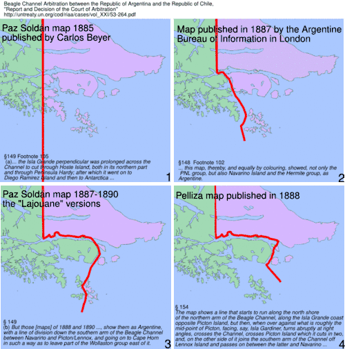 Au vu des cartes exposées dans cette page, il est possible d'apprécier le manque de connaissances de la géographie par les navigateurs et explorateurs de la zone ainsi que des hommes d'État qui eurent à se prononcer sur les frontières. Néanmoins, lorsque le traité frontalier de 1881 entre le Chili et l'Argentine fut signé, les principales îles et les voies navigables dans la zone du canal Beagle, au moins, étaient connues.