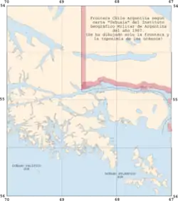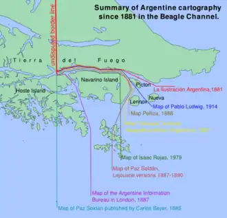 - ↑ (de) Andrea Wagner, Der argentinisch-chilenische Konflikt um den Beagle-Kanal. Ein Beitrag zu den Methoden friedlicher Streiterledigung. Verlag Peter Lang, Frankfort sur le Main, 1992, (ISBN 3-631-43590-8) p. 106 :«Resumé:Es existierten verschiedene argentinische Karten, die die Rechtauffassung Chiles widerspiegelten, v.a. in der Zeit unmittelbar nach dem Abschluß des Grenzvertrages von 1881. Das chilenische Kartenmaterial war dagegen stets einheitlich geblieben, und hat nur die chilenische Auffassung wiedergegeben.»