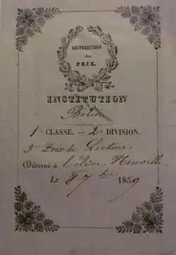 - ↑ Ex-præmio : inscription manuscrite ou étiquette pré-imprimée placée sur les premières gardes indiquant le nom d'un élève et la matière pour laquelle il est récompensé.