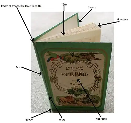 - ↑ Tranchefile : fil ou rouleau de papier (recouvert de soie, tissu, papier ou cuir) placé aux deux extrémités du dos d'un livre et qui sert à soutenir la coiffe.