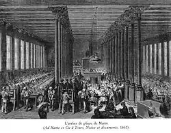 - la première, c’est que la machine y fait son apparition. Ces outils sont en constante amélioration. On voit dans ces ateliers l’arrivée de la machine à coudre dès 1851, même si la couture des livres est souvent encore manuelle, la machine à coudre ne donnant pas encore entière satisfaction. On y voit aussi l’étau à endosser[note 2] remplacé en 1855 par le rouleau à endosser, le massicot et enfin, la presse à balancier[note 3],[note 4] et la dorure des couvertures à l'aide de plaques gravées, innovation qui soulagera considérablement le travail de l’ouvrier ;