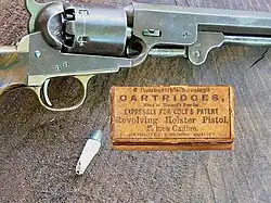 La cartouche combustible pour les armes de poing fut très en vogue dans les années 1860 aux États-Unis pour les armes dites cap and ball (en) comme le Colt 1851, le 1860 ou le Remington 1858 pour ne citer que les plus connus. Spécialement fabriquée et employée par les militaires, faite de papier traité au nitrate de potassium et par la suite par l'acide nitrique pour le rendre très inflammable, elle contenait la charge de poudre et sa balle collée à l'aide de la graisse de lubrification de la balle. Les calibres les plus courants étant le .44 Army et le .36 Navy et plus rarement le calibre .31. Elle est de nouveau fabriquée à ce jour pour les nombreuses répliques modernes de ces armes.
