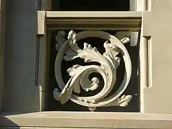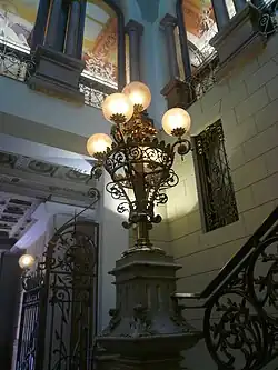 L'édifice est orné sur la balustrade supérieure d'éléments décoratifs avec ornementation végétale, typique de l'éclectisme du bâtiment[6]. Les colonnes ioniques et les rambardes de pierre ornementales, ainsi que les balcons ouvragés et ferronneries intérieures sont aussi remarquables[2].