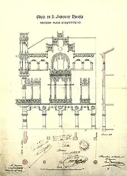 Au second étage, les fenêtres ont une structure qui réplique les arcades du rez-de-chaussée : colonnes avec chapiteaux floraux et arcs lobés, mais à une échelle réduite. Les fenêtres forment une série continue, faisant écho à la galerie, qui n'est interrompue que par une grande fenêtre en arc brisé qui donne sur la tribune du premier étage et par un petit balcon hexagonal avec un seuil fleuri fait en pierre. Sur ce dernier se trouvait une tour qui occupait le sommet de l'angle entre les deux façades et qui fut détruit lors du bombardement du 26 mars 1938 durant la Guerre civile. Il n'a pas été restauré. La partie la plus haute de la façade est couverte par un avant-toit profusément décoré. Le second étage était destiné à loger le personnel de service et de la boutique[13].