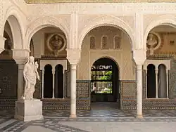 Après avoir franchi un mur percé d'une cancela du XVIIIe siècle (porte en fer forgé qui, dans les maisons andalouses, sépare le vestibule du patio) et orné de grands massifs de glycines, le visiteur accède au patio principal, véritable cœur et porte d'entrée des parties résidentielles, autour duquel sont distribuées les différentes pièces. De par sa composition, le patio est de style renaissance ; il présente toutefois de remarquables éléments mudéjars et gothiques, la synthèse de ces différents courants concourant à l'élégance et à l'originalité de l’ensemble. Autour de la cour centrale carrée courent deux séries d'arcs réparties sur deux niveaux et ouvrant chacune sur une galerie donnant accès aux salles. Le premier niveau d'arcades entoure complètement la cour. La forme, en plein cintre, et la décoration des arcs sont très nettement inspirées de l’art mudéjar : des stucs délicats envahissent tout l'espace décoratif depuis les écoinçons jusqu'à la base du niveau supérieur. Le deuxième niveau d'arcades, à l'étage supérieur, n'entoure que trois côtés de la cour : le côté donnant sur l’apeadero est aménagé sous forme de terrasse. Les arcs, en anse de panier, sont d'inspiration renaissance. Polychromes, ils sont soutenus par des colonnes aux chapiteaux en feuilles d'acanthe, rappelant ceux de la période califale, tels qu'on peut les voir à la Mosquée de Cordoue. Une balustrade ajourée de style gothique court tout le long du deuxième niveau. Au centre de la cour, pavée de dalles de marbre, trône une fontaine en marbre à double vasque, très nettement italianisante, et pétrie de références à l'Antiquité classique. Un groupe de dauphins sculptés est adossé au pied central de la fontaine, qui soutient la vasque supérieure, circulaire, couronnée d'une statue de Janus. Deux statues d'Athéna ornent les angles de la cour. L'une d’entre elles est un original grec du IVe siècle av. J.-C., tandis que l'autre est une copie romaine restaurée au XVIe siècle[12].