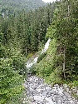 Elle est constituée de trois sauts : les deux premiers en amont de la route séparés par un court replat qui constitue la chute amont et un dernier en aval de la route après une courte course du torrent qui constitue la chute aval. La chute amont mesure une centaine de mètres de hauteur avec un ressaut à mi-hauteur qui peut-être impressionnant au moment de la fonte des neiges en raison du rebond de l'eau sur la dalle de pierre. En cas de fort débit, les projections d'eau rendent les pierres glissantes aux abords, des accidents se sont déjà produits dans ces conditions dangereuses.