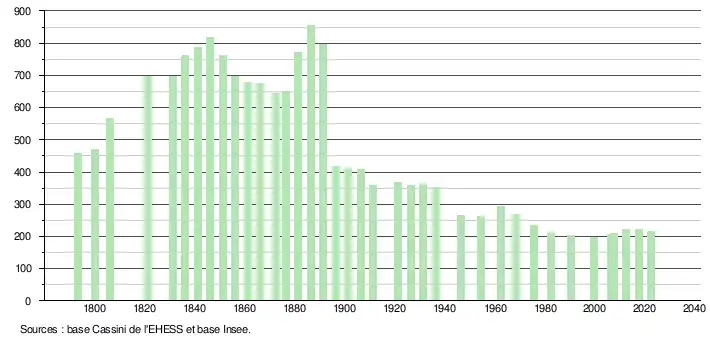 L'évolution du nombre d'habitants est connue à travers les recensements de la population effectués dans la commune depuis 1793. Pour les communes de moins de 10 000 habitants, une enquête de recensement portant sur toute la population est réalisée tous les cinq ans, les populations de référence des années intermédiaires étant quant à elles estimées par interpolation ou extrapolation[32]. Pour la commune, le premier recensement exhaustif entrant dans le cadre du nouveau dispositif a été réalisé en 2007[33].