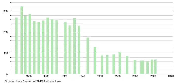 L'évolution du nombre d'habitants est connue à travers les recensements de la population effectués dans la commune depuis 1866. Pour les communes de moins de 10 000 habitants, une enquête de recensement portant sur toute la population est réalisée tous les cinq ans, les populations de référence des années intermédiaires étant quant à elles estimées par interpolation ou extrapolation[10]. Pour la commune, le premier recensement exhaustif entrant dans le cadre du nouveau dispositif a été réalisé en 2008[11].