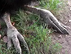 Ses pattes sont grosses et puissantes, terminées par trois doigts : le doigt intérieur porte une griffe aussi dangereuse qu'un poignard.
