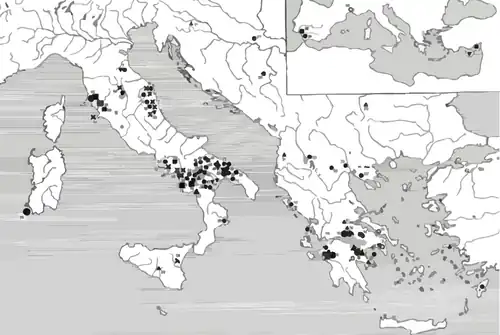 - ↑ De La Genière, J. 1968, L'Âge du Fer en Italie Méridionale: Sala Consilina, Naples.