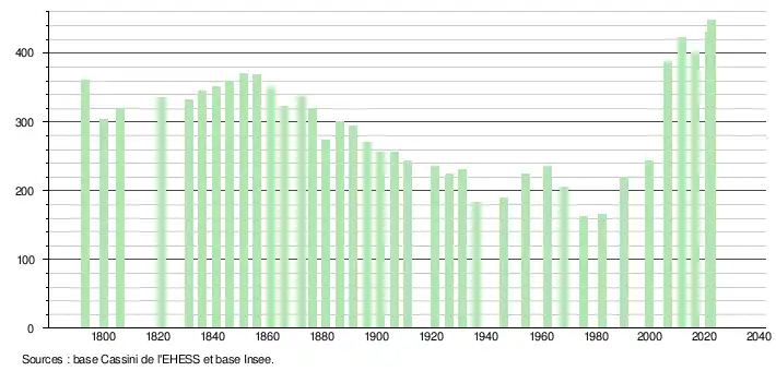 L'évolution du nombre d'habitants est connue à travers les recensements de la population effectués dans la commune depuis 1793. Pour les communes de moins de 10 000 habitants, une enquête de recensement portant sur toute la population est réalisée tous les cinq ans, les populations de référence des années intermédiaires étant quant à elles estimées par interpolation ou extrapolation[23]. Pour la commune, le premier recensement exhaustif entrant dans le cadre du nouveau dispositif a été réalisé en 2006[24].