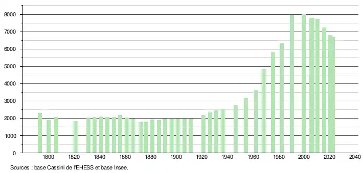- ↑ Population municipale de référence en vigueur au 1er janvier 2025, millésimée 2022, définie dans les limites territoriales en vigueur au 1er janvier 2024, date de référence statistique : 1er janvier 2022.