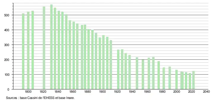 L'évolution du nombre d'habitants est connue à travers les recensements de la population effectués dans la commune depuis 1793. Pour les communes de moins de 10 000 habitants, une enquête de recensement portant sur toute la population est réalisée tous les cinq ans, les populations de référence des années intermédiaires étant quant à elles estimées par interpolation ou extrapolation[29]. Pour la commune, le premier recensement exhaustif entrant dans le cadre du nouveau dispositif a été réalisé en 2007[30].