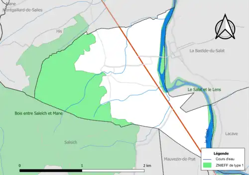 L’inventaire des zones naturelles d'intérêt écologique, faunistique et floristique (ZNIEFF) a pour objectif de réaliser une couverture des zones les plus intéressantes sur le plan écologique, essentiellement dans la perspective d’améliorer la connaissance du patrimoine naturel national et de fournir aux différents décideurs un outil d’aide à la prise en compte de l’environnement dans l’aménagement du territoire. Deux ZNIEFF de type 1[Note 3] sont recensées sur la commune[22] : les « bois entre Saleich et Mane » (882 ha), couvrant 6 communes du département[23] et « le Salat et le Lens » (713 ha), couvrant 32 communes dont 21 dans l'Ariège et 11 dans la Haute-Garonne[24] et une ZNIEFF de type 2[Note 4],[22] : le « massif de l'Arbas » (27 233 ha), couvrant 45 communes dont 24 dans l'Ariège et 21 dans la Haute-Garonne[25].