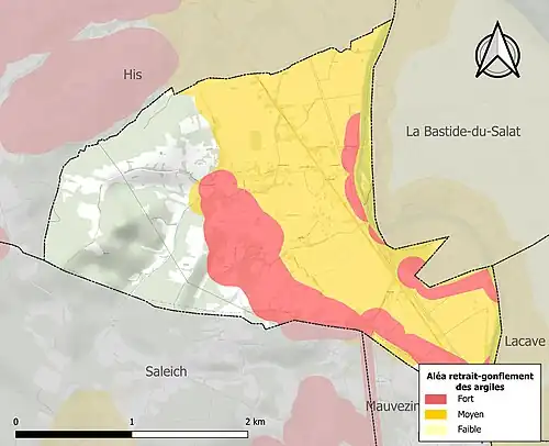La commune est vulnérable au risque de mouvements de terrains constitué principalement du retrait-gonflement des sols argileux[32]. Cet aléa est susceptible d'engendrer des dommages importants aux bâtiments en cas d’alternance de périodes de sécheresse et de pluie. 67,2 % de la superficie communale est en aléa moyen ou fort (88,8 % au niveau départemental et 48,5 % au niveau national). Sur les 89 bâtiments dénombrés sur la commune en 2019, 85 sont en aléa moyen ou fort, soit 96 %, à comparer aux 98 % au niveau départemental et 54 % au niveau national. Une cartographie de l'exposition du territoire national au retrait gonflement des sols argileux est disponible sur le site du BRGM[33],[Carte 3].
