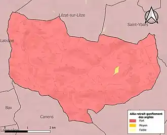 La commune est vulnérable au risque de mouvements de terrains constitué principalement du retrait-gonflement des sols argileux[25]. Cet aléa est susceptible d'engendrer des dommages importants aux bâtiments en cas d’alternance de périodes de sécheresse et de pluie. La totalité de la commune est en aléa moyen ou fort (88,8 % au niveau départemental et 48,5 % au niveau national). Sur les 141 bâtiments dénombrés sur la commune en 2019, 141 sont en aléa moyen ou fort, soit 100 %, à comparer aux 98 % au niveau départemental et 54 % au niveau national. Une cartographie de l'exposition du territoire national au retrait gonflement des sols argileux est disponible sur le site du BRGM[26],[Carte 3].