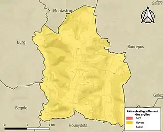 Le retrait-gonflement des sols argileux est susceptible d'engendrer des dommages importants aux bâtiments en cas d’alternance de périodes de sécheresse et de pluie. La totalité de la commune est en aléa moyen ou fort (44,5 % au niveau départemental et 48,5 % au niveau national). Sur les 66 bâtiments dénombrés dans la commune en 2019, 66 sont en aléa moyen ou fort, soit 100 %, à comparer aux 75 % au niveau départemental et 54 % au niveau national. Une cartographie de l'exposition du territoire national au retrait gonflement des sols argileux est disponible sur le site du BRGM[20],[Carte 3].