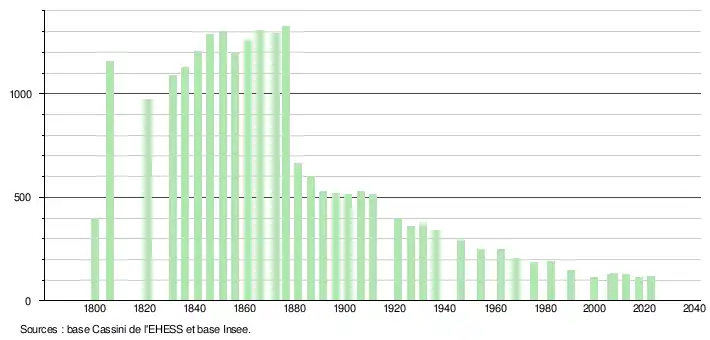 L'évolution du nombre d'habitants est connue à travers les recensements de la population effectués dans la commune depuis 1800. Pour les communes de moins de 10 000 habitants, une enquête de recensement portant sur toute la population est réalisée tous les cinq ans, les populations de référence des années intermédiaires étant quant à elles estimées par interpolation ou extrapolation[51]. Pour la commune, le premier recensement exhaustif entrant dans le cadre du nouveau dispositif a été réalisé en 2007[52].
