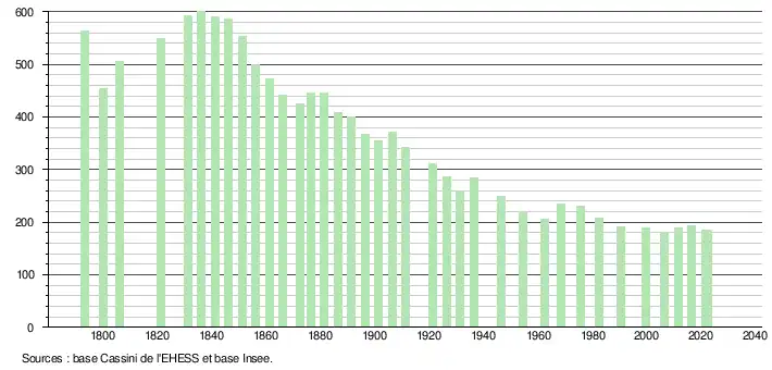 | L'évolution du nombre d'habitants est connue à travers les recensements de la population effectués dans la commune depuis 1793. Pour les communes de moins de 10 000 habitants, une enquête de recensement portant sur toute la population est réalisée tous les cinq ans, les populations de référence des années intermédiaires étant quant à elles estimées par interpolation ou extrapolation[21]. Pour la commune, le premier recensement exhaustif entrant dans le cadre du nouveau dispositif a été réalisé en 2006[22]. En 2022, la commune comptait 185 habitants[Note 1], en évolution de −4,64 % par rapport à 2016 (Landes : +5,78 %, France hors Mayotte : +2,11 %). |