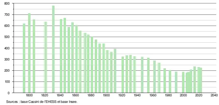 L'évolution du nombre d'habitants est connue à travers les recensements de la population effectués dans la commune depuis 1793. Pour les communes de moins de 10 000 habitants, une enquête de recensement portant sur toute la population est réalisée tous les cinq ans, les populations de référence des années intermédiaires étant quant à elles estimées par interpolation ou extrapolation[23]. Pour la commune, le premier recensement exhaustif entrant dans le cadre du nouveau dispositif a été réalisé en 2004[24].
