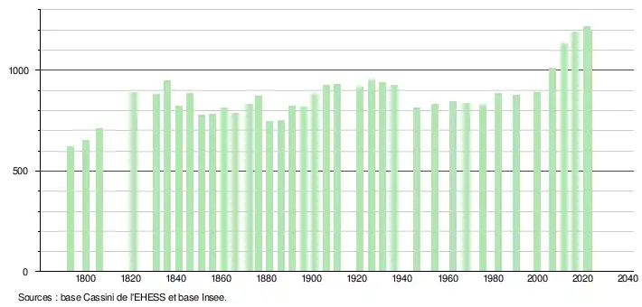 L'évolution du nombre d'habitants est connue à travers les recensements de la population effectués dans la commune depuis 1793. Pour les communes de moins de 10 000 habitants, une enquête de recensement portant sur toute la population est réalisée tous les cinq ans, les populations de référence des années intermédiaires étant quant à elles estimées par interpolation ou extrapolation[22]. Pour la commune, le premier recensement exhaustif entrant dans le cadre du nouveau dispositif a été réalisé en 2006[23].