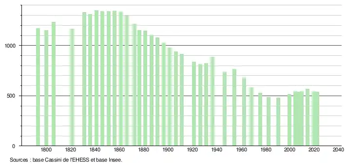 | L'évolution du nombre d'habitants est connue à travers les recensements de la population effectués dans la commune depuis 1793. Pour les communes de moins de 10 000 habitants, une enquête de recensement portant sur toute la population est réalisée tous les cinq ans, les populations de référence des années intermédiaires étant quant à elles estimées par interpolation ou extrapolation[33]. Pour la commune, le premier recensement exhaustif entrant dans le cadre du nouveau dispositif a été réalisé en 2004[34]. En 2022, la commune comptait 540 habitants[Note 7], en évolution de −7,22 % par rapport à 2016 (Tarn-et-Garonne : +3,12 %, France hors Mayotte : +2,11 %). |
