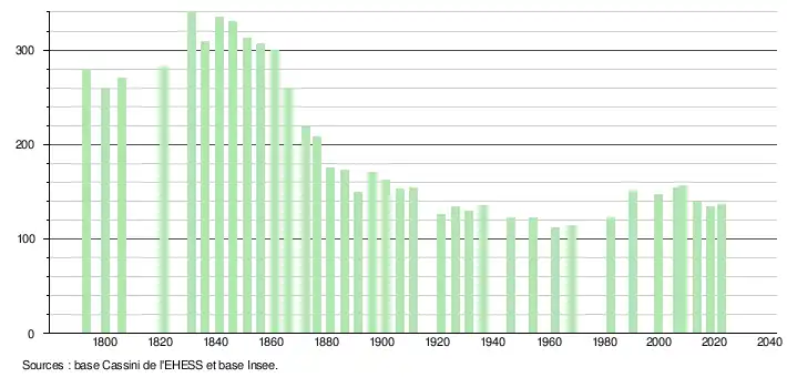 L'évolution du nombre d'habitants est connue à travers les recensements de la population effectués dans la commune depuis 1793. Pour les communes de moins de 10 000 habitants, une enquête de recensement portant sur toute la population est réalisée tous les cinq ans, les populations de référence des années intermédiaires étant quant à elles estimées par interpolation ou extrapolation[45]. Pour la commune, le premier recensement exhaustif entrant dans le cadre du nouveau dispositif a été réalisé en 2008[46].