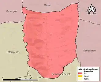 Le retrait-gonflement des sols argileux est susceptible d'engendrer des dommages importants aux bâtiments en cas d’alternance de périodes de sécheresse et de pluie. La totalité de la commune est en aléa moyen ou fort (94,5 % au niveau départemental et 48,5 % au niveau national). Sur les 57 bâtiments dénombrés sur la commune en 2019, 57 sont en aléa moyen ou fort, soit 100 %, à comparer aux 93 % au niveau départemental et 54 % au niveau national. Une cartographie de l'exposition du territoire national au retrait gonflement des sols argileux est disponible sur le site du BRGM[19],[Carte 3].