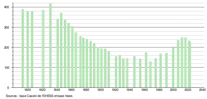 L'évolution du nombre d'habitants est connue à travers les recensements de la population effectués dans la commune depuis 1793. Pour les communes de moins de 10 000 habitants, une enquête de recensement portant sur toute la population est réalisée tous les cinq ans, les populations de référence des années intermédiaires étant quant à elles estimées par interpolation ou extrapolation[24]. Pour la commune, le premier recensement exhaustif entrant dans le cadre du nouveau dispositif a été réalisé en 2006[25].