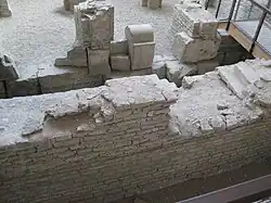Le rempart utilise localement comme base de ses fondations des bâtiments plus anciens arasés. À d'autres endroits, des éléments de remploi sont retrouvé dans la tranchée de fondation[6].