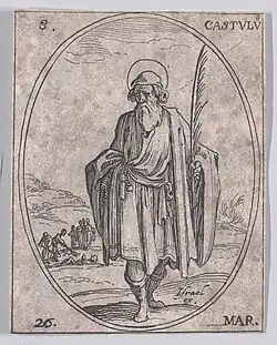 Selon une Passio, Castule est officier (chambellan ou trésorier) du palais de l'empereur romain Dioclétien. Époux de sainte Irène, il est lié à saint Sébastien qu'il présente à la cour ; après s'être converti au christianisme, il assiste les chrétiens emprisonnés, en particulier les martyrs Marc et Marcellianus[1]. Avec Tiburce, il amène à la conversion au christianisme des hommes et des femmes qu'il présente au pape Caïus qui leur administre le baptême. Ils sont trahis par un apostat, Torquatus, qui les dénonce au préfet de la ville Fabianus. Castule est martyrisé, enterré dans une fosse et enseveli vivant sous la terre qu'on a jeté sur lui.