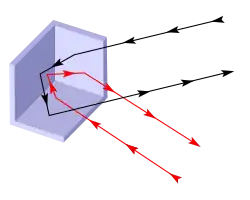 On considère un système composé de trois miroirs placés à angles droits dans les trois plans de l'espace (formant un trièdre, aussi appelé « coin de cube »). Lorsque la lumière atteint l'un des miroirs, elle est renvoyée vers le deuxième, puis vers le troisième, puis vers l'émetteur. Grâce à la perpendicularité des miroirs, les angles des réflexions successives se compensent, de manière à envoyer, à la fin, le rayon parallèlement au rayon incident, avec un léger décalage, lié à la distance entre le point d'entrée du rayon sur le premier miroir et le point de convergence des miroirs (décalage le plus souvent négligeable).
