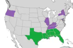 Selon POWO[5], l’aire de répartition naturelle de l’espèce s’étend de l’est du Texas au sud de la Géorgie aux États-Unis. L’origine de l’espèce se situe au Texas, Louisiane, Alabama, Géorgie, Mississippi, Floride, et (?) Vermont (en vert sur la carte).