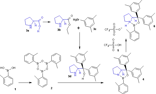 La synthèse est effectuée à partir de la (S)-proline ou d'un dérivé de la proline est énantiomériquement pur. Tout d'abord, le groupe amino de la proline est protégé par d'un groupe protecteur carboxybenzyle (Cbz), puis l'acide carboxylique est converti en ester de méthyle. Une réaction de Grignard avec le chlorure de phénylmagnésium conduit alors à l'alcool tertiaire. L'élimination du groupe protecteur et la réaction ultérieure avec l'acide méthylboronique aboutissent au catalyseur CBS.
