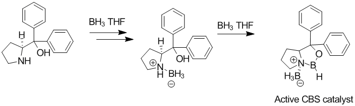 Le catalyseur CBS peut également être préparé à partir du diphénylprolinol[1] qui se condense avec l'acide phénylboronique ou le borane. Le catlyseur CBS ainsi obtenu se complexe in situ avec le borane pour donner la forme active du catalyseur[2].