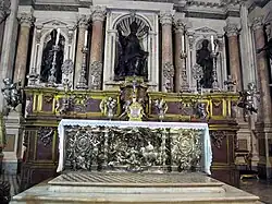 La quatrième chapelle est appelée chapelle des Reliques car elle abrite toutes les reliques de la ville appartenant aux corps religieux supprimés[8], dont une relique de la dent de saintCésaire de Terracina[9], le saint tutélaire des empereurs, choisi pour remplacer et christianiser le culte du premier empereur Auguste et des divins Césars de Naples ; le retable est d'Andrea Malinconico.