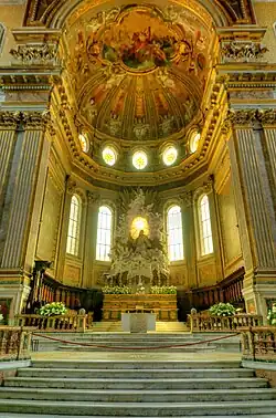 L'abside de la cathédrale, telle qu'elle apparaît aujourd'hui, est le résultat des modifications apportées aux XVIe et XVIIIe siècles à la structure polygonale gothique originale. Lors des restaurations réalisées par l'architecte siennois (mais de l'école romaine) Paolo Posi dans un style rococo, à partir de 1714, à la demande du cardinal Spinelli, la voûte fut abaissée et le chœur allongé jusqu'à occuper une partie du transept. Le maître-autel, dans lequel sont conservées les reliques des saints Agrippin, Acuzio et Eutichio, est dominé par la sculpture représentant l' Assomption de Pietro Bracci[12] (sculpteur connu pour le groupe statuaire au centre de la fontaine de Trevi), créé en 1739 et clairement inspiré de la Chaire de saint Pierre du Bernin et de l'ancien Crucifix du XIIIe siècle.