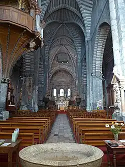 - La nef principale, avec ses ogives gothiques ; au fond du chœur, l'abside romane.