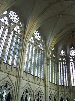 La partie la plus ancienne de l'édifice, la nef, haute de 42,3 mètres, vue depuis le triforium du chœur. Au fond, la rosace flamboyante surmontant la tribune des grandes orgues.