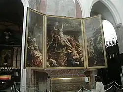 • L'Érection de la croix - triptyque de Rubens (huile sur panneau de 4,60 m × 3,40 m pour le panneau central et 4,60 m × 1,50 m pour les panneaux latéraux). Ce tableau a été conçu pour le maître-autel de l'ancienne église Sainte-Walburge près du Steen, et transféré à la cathédrale en 1816.
