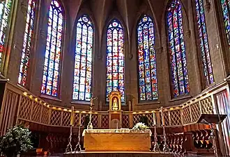 - Les grandes verrières du chœur créées par Louis Barillet de Paris.