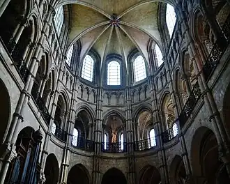 Au-dessus, un triforium aveugle est composé de quatre petites arcades par travée. Enfin, le niveau des fenêtres hautes est composé de doubles baies.