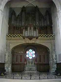L'orgue de tribune est construit à partir de 1762 par le facteur d'orgues nancéien Nicolas Dupont[22], à la suite du grand incendie de 1755. Il est doté d'un buffet de style Louis XV avec un grand orgue à six tourelles mesurant 12 m de large sur 10 m de haut, et un positif à quatre tourelles de 3,5 m de large sur 3 m de haut[26]. Il est installé en 1766 dans le croisillon sud et compte 44 jeux répartis sur 4 claviers de 61 notes et un pédalier. Il est sauvé de la Révolution française par l'organiste Spery. Il connaît de légers remaniements de Jean-Baptiste Gavot en 1829 et Jean-Nicolas Jeanpierre en 1868[27].