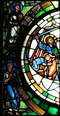 - ↑ Le texte en majuscule reprend les lettres et les points inscrits dans le vitrail.