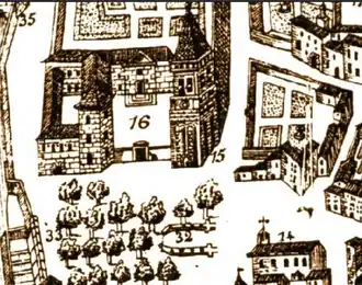 Plan de Castres en 1674 : l'église Saint-Benoît (no 14), les vestiges de l'ancienne cathédrale (no 32), les Ormeaux de l'évêché (no 33), le clocher (no 15) et le palais épiscopal (no 16)